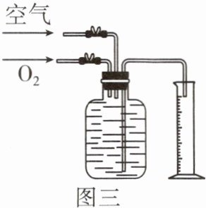 (4)某同学欲收集氧气体积分数约为60%的气体,采用图三所示装置进行收集。在瓶中装满水,塞紧橡胶塞并打开活塞通入氧气,当量筒中的水达到设定的$V$mL后立即改通空气,当量筒中的水的体积达到100mL时,立即关闭活塞,则设定体积$V$约为______。