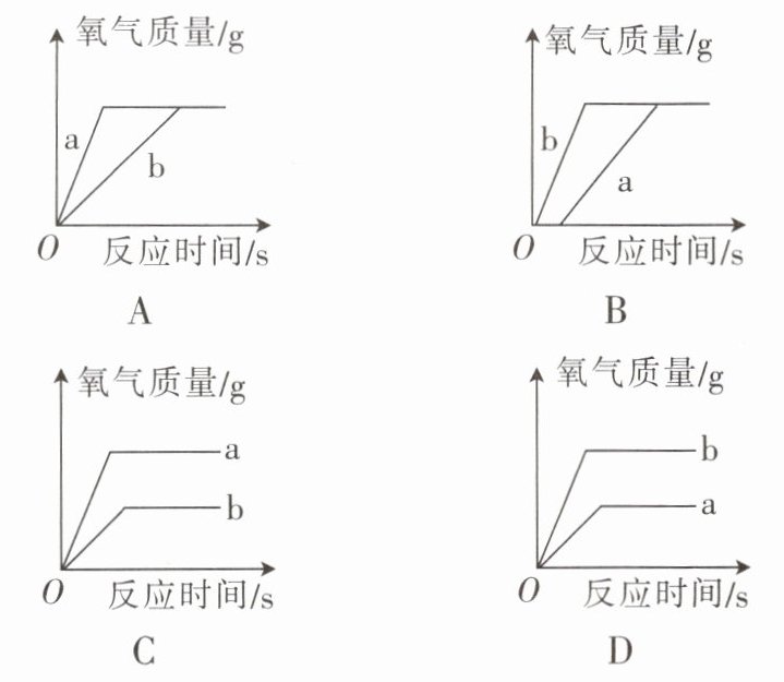 7. 现有 a、b 两支试管,a 试管内装有少量二氧化锰,同时往两支试管内滴加相同体积、相同浓度的过氧化氢溶液,能正确表示 a、b 两支试管放出氧气质量(纵坐标)与反应时间(横坐标)关系的图像是( )