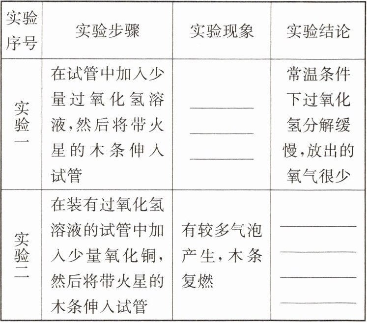 |实验二|在装有过氧化氢溶液的试管中加入少量氧化铜,然后将带火星的木条伸入试管|有较多气泡产生,木条复燃|______|