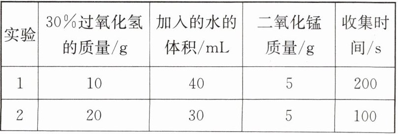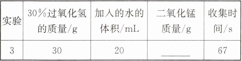 |实验|30%过氧化氢的质量/g|加入的水的体积/mL|二氧化锰质量/g|收集时间/s|