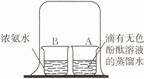 2. 如图所示,在小烧杯 A 中盛有滴有无色酚酞溶液的蒸馏水,然后向小烧杯 B 中倒入浓氨水,立即用大烧杯罩住烧杯 A 和 B,一段时间后,发现烧杯 A 中溶液由无色变为红色(无色酚酞溶液遇碱性物质会变红)。下列有关说法错误的是( )