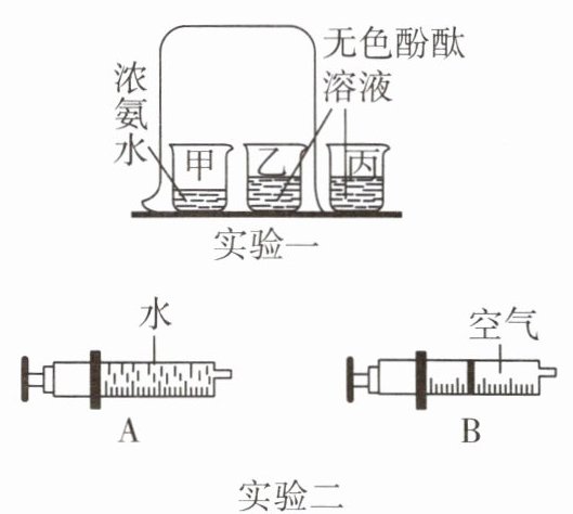 (2) 实验二是用 10 mL 注射器分别吸取相同体积的水和空气,用手指堵住末端,并按压注射器活塞,发现容易被压缩的是注射器______(填字母),原因是______,物质压缩前后分子数目______(填“改变”或“不变”)。