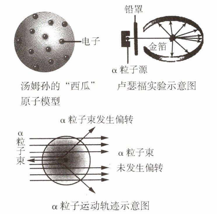 12. 人们为了揭示原子结构的奥秘,经历了漫长的探究过程。自1897年汤姆孙发现电子并提出类似“西瓜”的原子模型,1909年著名物理学家卢瑟福等人为了探索原子的内部结构又进行了下面的实验。他们在用一束带正电的、质量比电子大得多的、高速运动的α粒子轰击金箔时,发现: