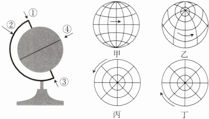 1. 右侧图中的①②③④箭头表示从不同方向观察地球仪演示地球的自转。左边四个方向观察所见的经纬网形状和自转方向与右边甲、乙、丙、丁四图对应一致的是( )