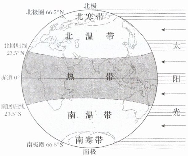 同一时间,地球上纬度不同的地区获得太阳热量的多少不同,人们据此划分了地球上的“五带”。读地球上的五带图,完成5~6题。