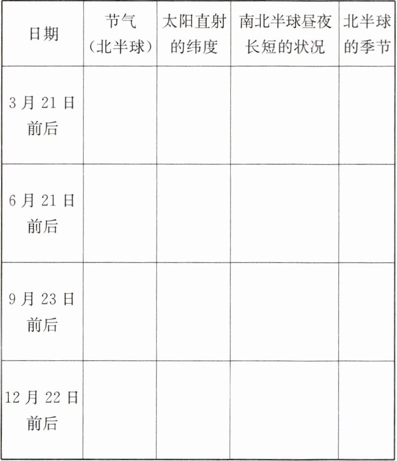 参照教材图1.21和图1.24,用地球仪和灯泡演示地球的公转。仔细观察地球公转运动时,太阳直射点的移动和昼夜的变化。以小组为单位,合作完成下表。