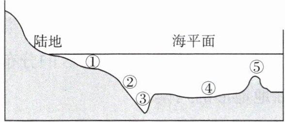 现代海洋探测结果表明,海洋底部也是高低起伏、形态多样的,从海岸到大洋中心,海底地形大致可以分为大陆架、大陆坡、海沟、洋盆和洋中脊等,其分布具有明显的规律性。读海底地形剖面示意图,完成 3~6 题。