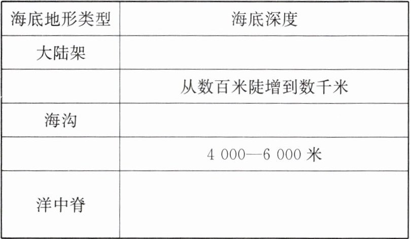 (2)从海岸到大洋中心,海底地形类型的分布存在一定的规律及深浅变化。查阅资料,完成下面表格。