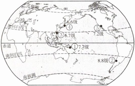 近年来,世界上发生了一系列强烈地震,下图显示了某五次大地震发生的地点和震级。读图,完成 12~13 题。