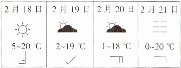 1. 例如:北京,晴转多云,气温-5~7℃;2. 穿衣指数、空气污染指数等;3. 2月18日,天气晴,气温适宜,可以进行户外活动;2月19日和20日,天气多云,气温较低,户外活动后,要注意及时添衣保暖;2月21日雾,气温低,不适宜开展户外活动,交通出行注意安全。
