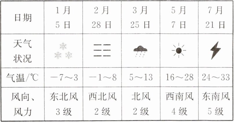 |气温/℃|-7~3|-1~8|5~13|16~28|24~33|