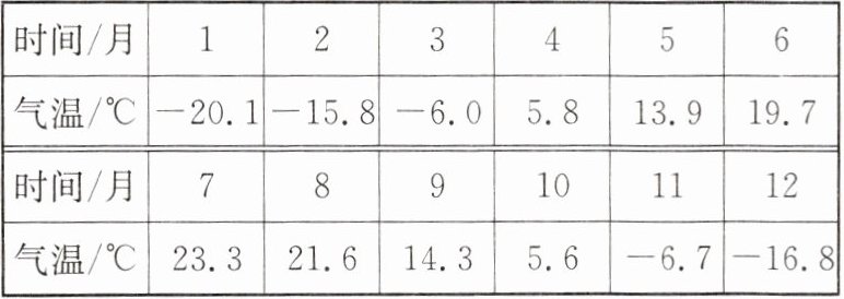 |气温/°C|-20.1|-15.8|-6.0|5.8|13.9|19.7|