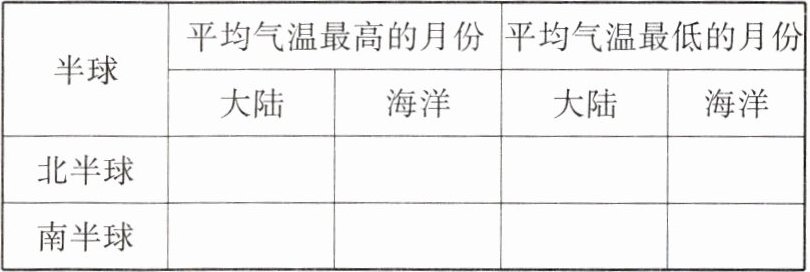 |半球|平均气温最高的月份|平均气温最低的月份|