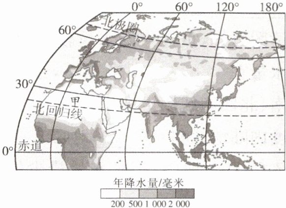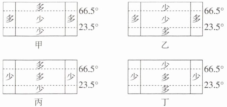 学习了世界年降水量的分布规律的相关知识之后,甲、乙、丙、丁四位同学结合亚欧大陆的纬度和海陆分布情况,绘制了四幅亚欧大陆降水的地区分布示意图。读图,完成5~6题。