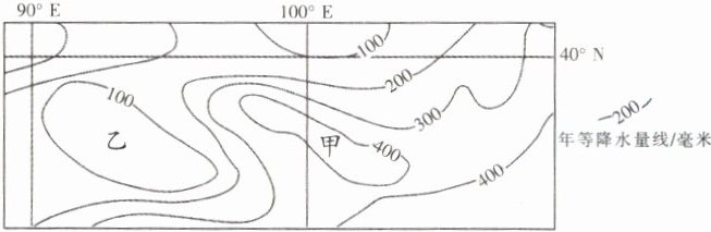 1. 读下方年等降水量线分布示意图,甲地和乙地的年降水量范围分别是( )