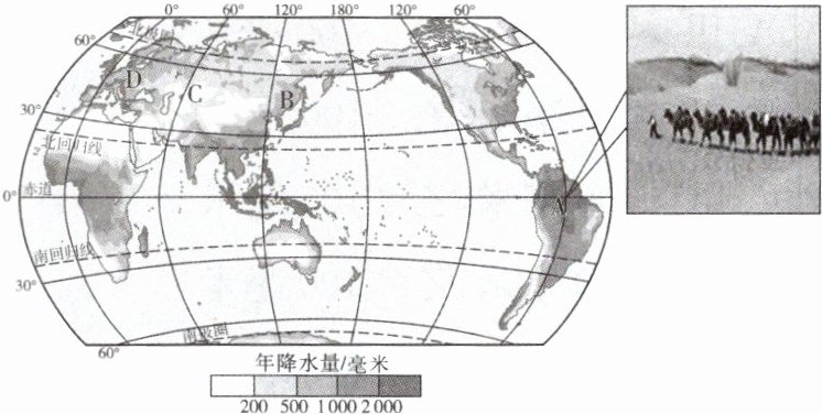 (4)判断真假。图中成群结队的骆驼在A地经常出现,你觉得这是真的还是假的?试说明判断依据。