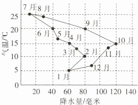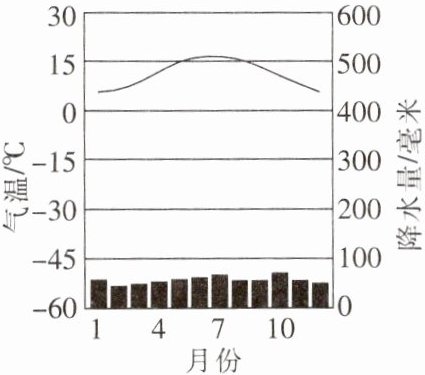 读某地气温曲线和降水量柱状图,完成 1~2 题。