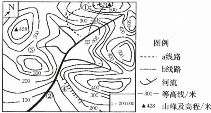 14. B 【解析】据图可以看出,甲地四周等高线向外数值不断增大,由此可以判断地势为四周高、中部低,属于盆地地形。 15. A 【解析】①山脊是河流的分水岭,A正确;②山谷是等高线向海拔高处弯曲,B错误;③鞍部是两山峰间比较平缓的部位,海拔相对较低,C错误;④陡崖没有河流经过,不能看到瀑布景观,D错误。 16. A 【解析】a线路比b线路等高线稀疏,坡度缓,登顶较省力,A正确;沿b线路登顶直线距离短,相对高度不变,B错误;若登山途中遇暴雨泥石流,不应逃回甲地躲避,应在高处躲避,因甲处低洼,C错误;完成登顶任务,同学们的爬升高度在371—421米之间,571米是山峰的海拔,D错误。 17. C 【解析】①地海拔较高,坡度较陡,不适合露营,A错误;②地为山谷,地势低洼,不适合露营,B错误;③地为鞍部,地势平缓利于扎营,C正确;④地为陡崖,过于陡峭,不适合露营,D错误。