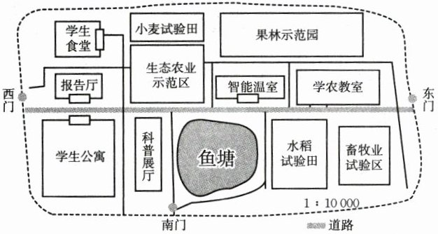 21. 某校学生到石家庄市学农基地开展实践活动。下图示意学农基地平面图。读图,完成下列问题。