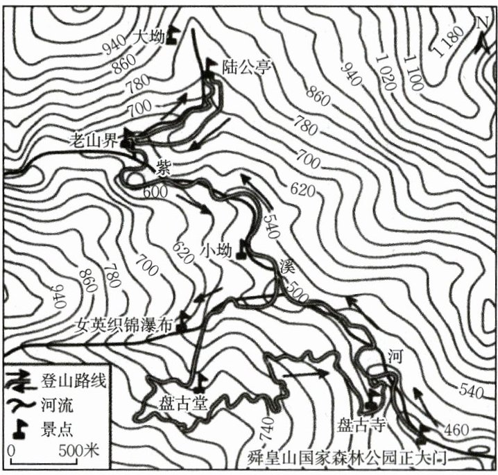 材料二 “巅峰湖南”六大名山登山赛(东安舜皇山站)越野登山组路线及舜皇山局部等高线(单位:米)地形图。