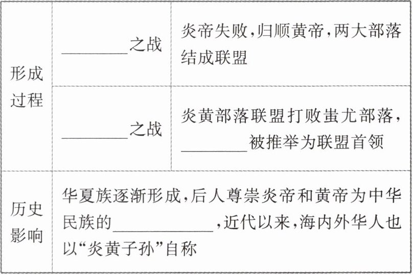 |形成过程|______之战|炎帝失败,归顺黄帝,两大部落结成联盟|