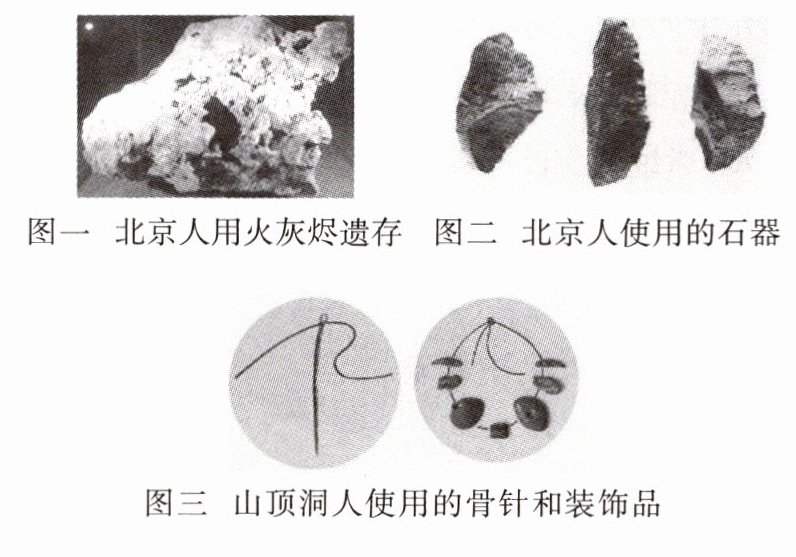 (2)图一,北京人已经学会使用火;图二,北京人会使用打制石器;图三,山顶洞人掌握了磨光和钻孔技术,有爱美意识。