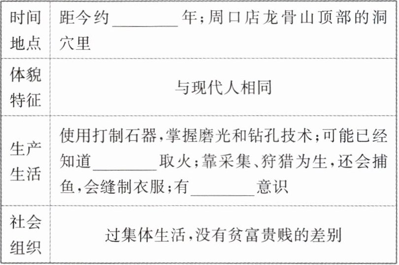 |生产生活|使用打制石器,掌握磨光和钻孔技术;可能已经知道____取火;靠采集、狩猎为生,还会捕鱼,会缝制衣服;有____意识|