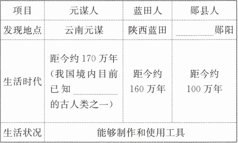 |生活时代|距今约 170 万年(我国境内目前已知____的古人类之一)|距今约 160 万年|距今约 100 万年|