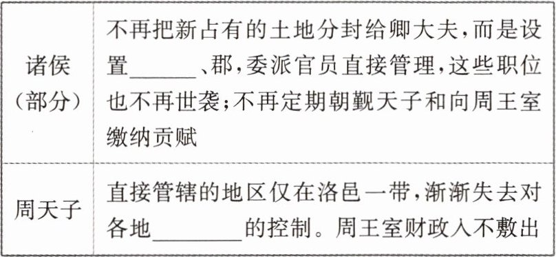 |诸侯(部分)|不再把新占有的土地分封给卿大夫,而是设置______、郡,委派官员直接管理,这些职位也不再世袭;不再定期朝觐天子和向周王室缴纳贡赋|