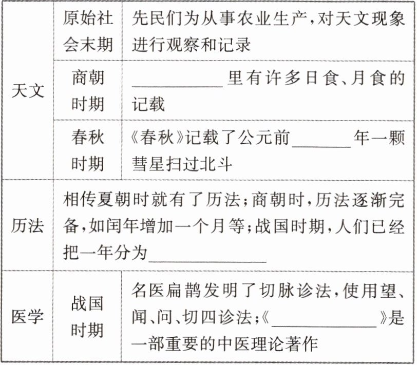 | 医学 | 战国时期 | 名医扁鹊发明了切脉诊法,使用望、闻、问、切四诊法;《______》是一部重要的中医理论著作 |
