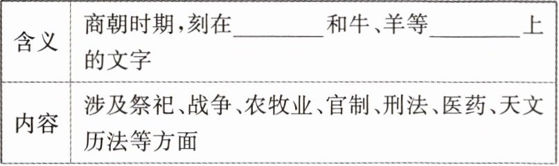 | 含义 | 商朝时期,刻在______和牛、羊等______上的文字 |