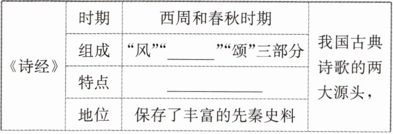 | 《诗经》 | 时期 | 西周和春秋时期 | 我国古典诗歌的两大源头, |