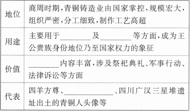 | 代表 | 四羊方尊、______、四川广汉三星堆遗址出土的青铜人头像等 |