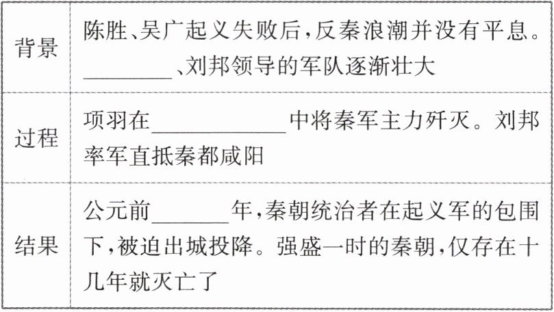 |结果|公元前______年,秦朝统治者在起义军的包围下,被迫出城投降。强盛一时的秦朝,仅存在十几年就灭亡了|