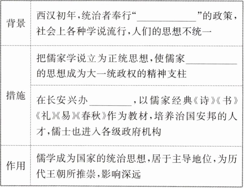 |背景|西汉初年,统治者奉行“______”的政策,社会上各种学说流行,人们的思想不统一|