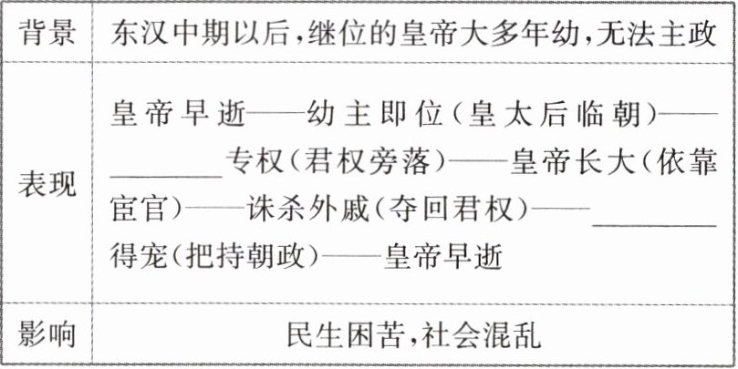 |表现|皇帝早逝——幼主即位(皇太后临朝)——______专权(君权旁落)——皇帝长大(依靠宦官)——诛杀外戚(夺回君权)——______得宠(把持朝政)——皇帝早逝|