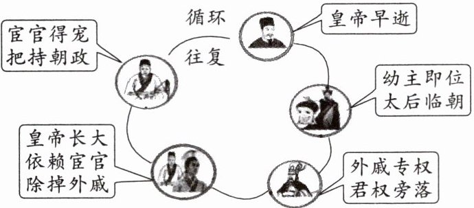 (3)政治现象:外戚、宦官交替专权。结果:导致政治腐朽不堪,社会混乱,动摇了东汉的统治基础,使东汉王朝走向衰亡。