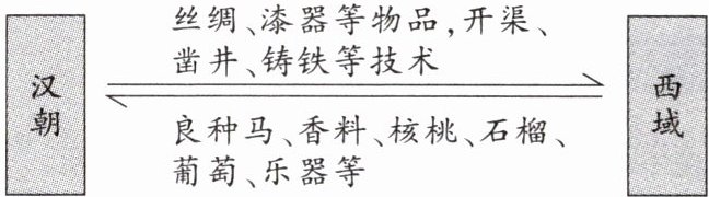 汉朝$\xtofrom[良种马、香料、核桃、石榴、葡萄、乐器等]{丝绸、漆器等物品,开渠、凿井、铸铁等技术}$西域