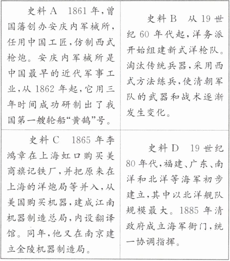 |史料B|从19世纪60年代起,洋务派开始组建新式洋枪队。淘汰传统兵器,采用西式方法练兵,使清朝军队的武器和战术逐渐发生变化。|