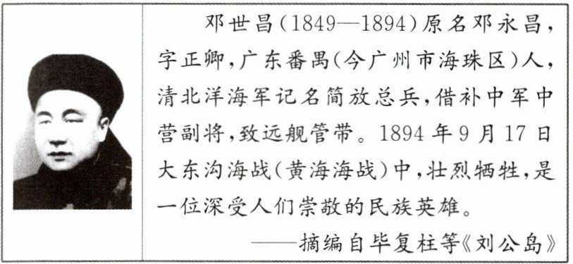 (2) 邓世昌是清北洋海军将领,在1894年黄海海战中,作为致远舰管带,面对日军舰队的进攻,他英勇抗击,在致远舰严重受损、弹药用尽的情况下,下令冲向日军“吉野”号,欲与敌同归于尽,不幸被鱼雷击中,与全舰官兵壮烈牺牲。展现了视死如归、爱国御侮的民族精神。