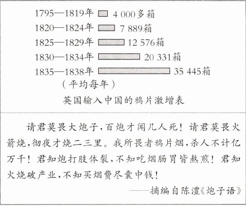 (1) 根据表格中的史料,回答1795年至1838年英国输入中国的鸦片数量的变化趋势,并谈谈英国向中国走私鸦片给中国带来的危害。