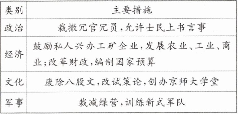 材料二 下表所示内容是某小组的同学归纳的维新变法的主要措施。