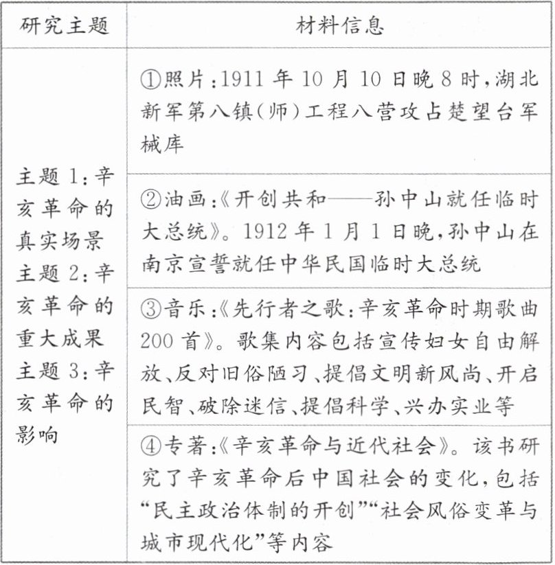 |主题3:辛亥革命的影响|③音乐:《先行者之歌:辛亥革命时期歌曲200首》。歌集内容包括宣传妇女自由解放、反对旧俗陋习、提倡文明新风尚、开启民智、破除迷信、提倡科学、兴办实业等|