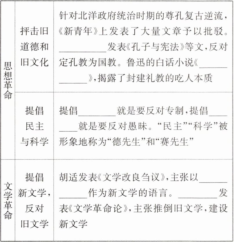 |思想革命|抨击旧道德和旧文化|针对北洋政府统治时期的尊孔复古逆流,《新青年》上发表了大量文章予以批驳。______发表《孔子与宪法》等文,反对定孔教为国教。鲁迅的白话小说《______》,揭露了封建礼教的吃人本质|