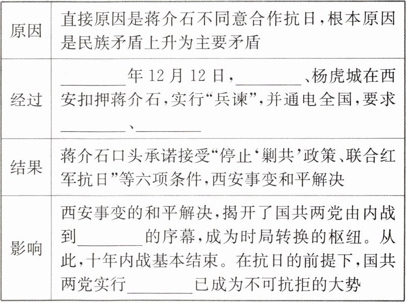 |经过|______年 12 月 12 日,______、杨虎城在西安扣押蒋介石,实行“兵谏”,并通电全国,要求______、______|
