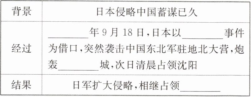 |经过|______年 9 月 18 日,日本以______事件为借口,突然袭击中国东北军驻地北大营,炮轰______城,次日清晨占领沈阳|