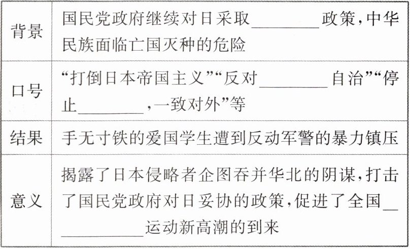 1.华北自治运动 2.不抵抗 华北 内战 抗日救亡 3.八一宣言 抗日民族统一战线