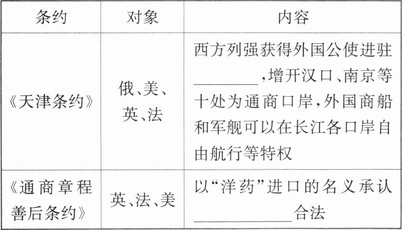 |《天津条约》|俄、美、英、法|西方列强获得外国公使进驻____,增开汉口、南京等十处为通商口岸,外国商船和军舰可以在长江各口岸自由航行等特权|