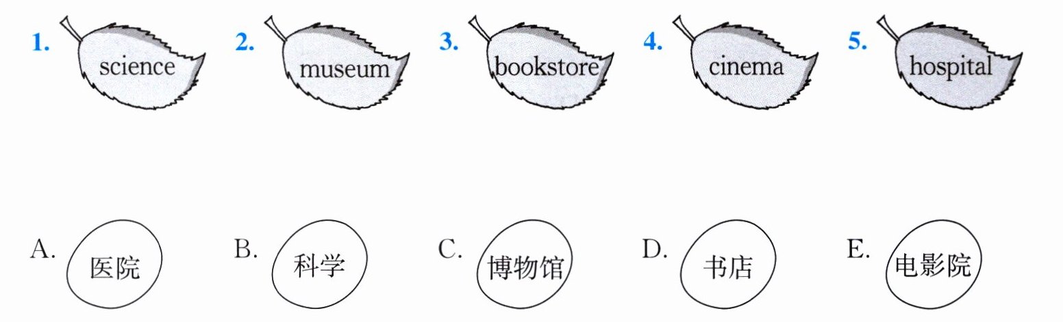 1. 紧邻 2. 博物馆商店 3. 劳驾;打扰一下 4. 一个会说话的机器人 5. science museum 6. post office 7. near the park 8. a pet hospital