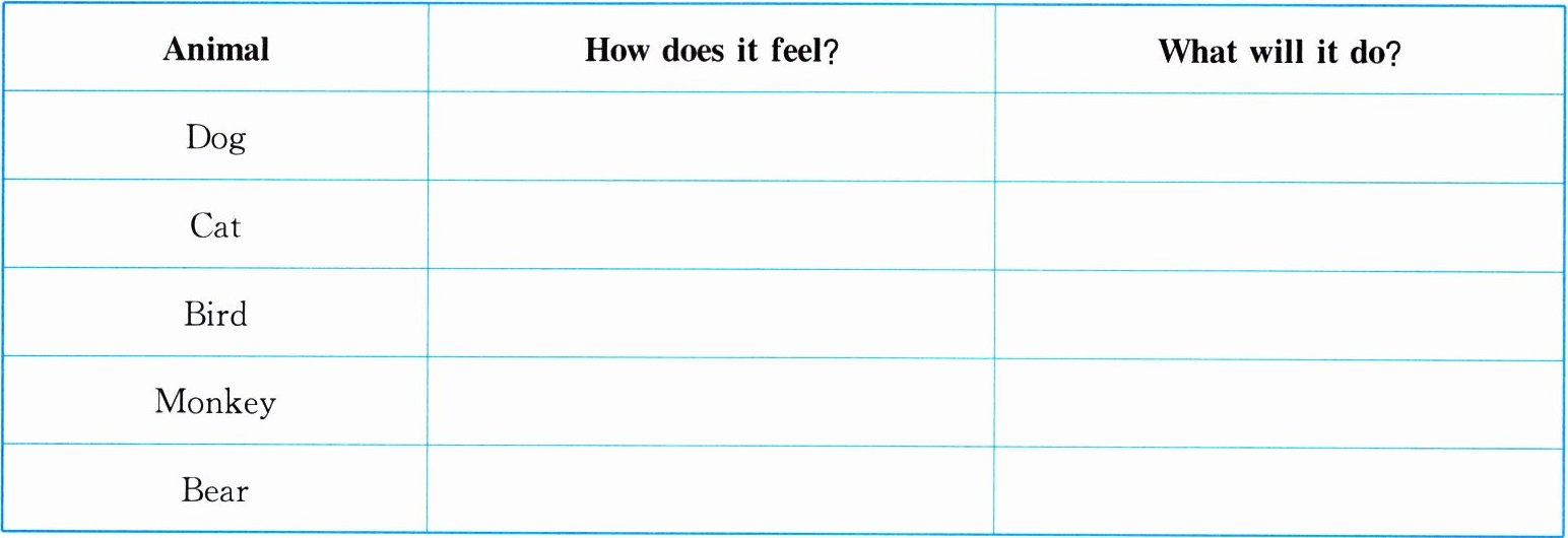 Animals have feelings(感觉), just like you and me. When a dog is happy, it will wag(摇摆)its tail. When a cat is angry, it will move its tail slowly. When a bird is happy, it will sing songs. When a monkey is afraid of you, it will run away(跑掉). When a bear is sad, it will sit quietly. How interesting it is!